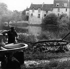 Au moyen de trois grandes barres terminées en crochet, les hommes retirent du foyer l'embat dilaté.